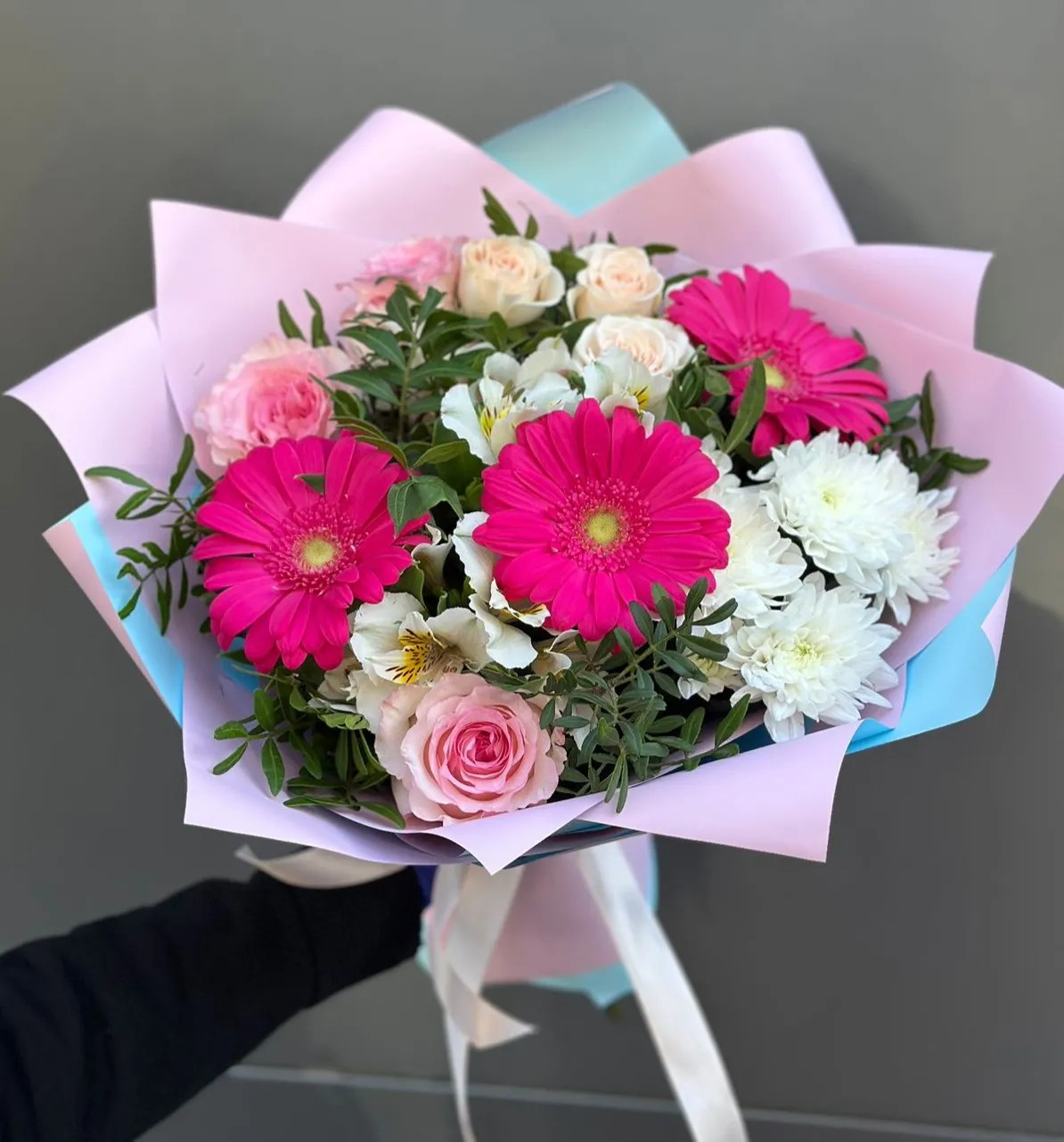 Этот изысканный букет, состоящий из розовых гербер, белой альстромерии, белой хризантемы и розовых роз, является настоящим произведением искусства. Яркие розовые герберы, словно солнечные лучи, привлекают внимание своей живостью и радостью, символизируя оптимизм и жизнерадостность. Белая альстромерия, с её нежными лепестками, добавляет букету лёгкость и изящество, олицетворяя чистоту и искренность чувств.