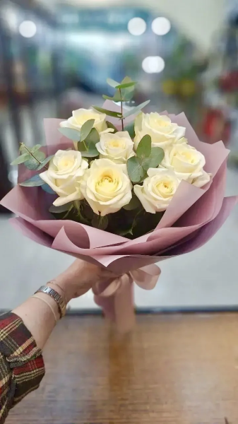 Элегантный букет с белой розой сорта «Канди Лайт» - воплощение чистоты, утончённости и спокойной роскоши.
