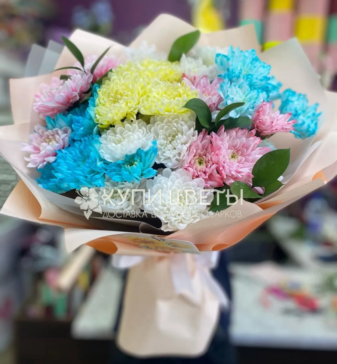 Махровые кустовые хризантемы с их множеством изящных лепестков выглядят нежно и воздушно, при этом сохраняя графичность и объем. Этот букет универсален: он подойдет как для трогательного поздравления, так и для создания уютной атмосферы дома. Он станет прекрасным подарком, выражающим тепло, заботу и светлые чувства.