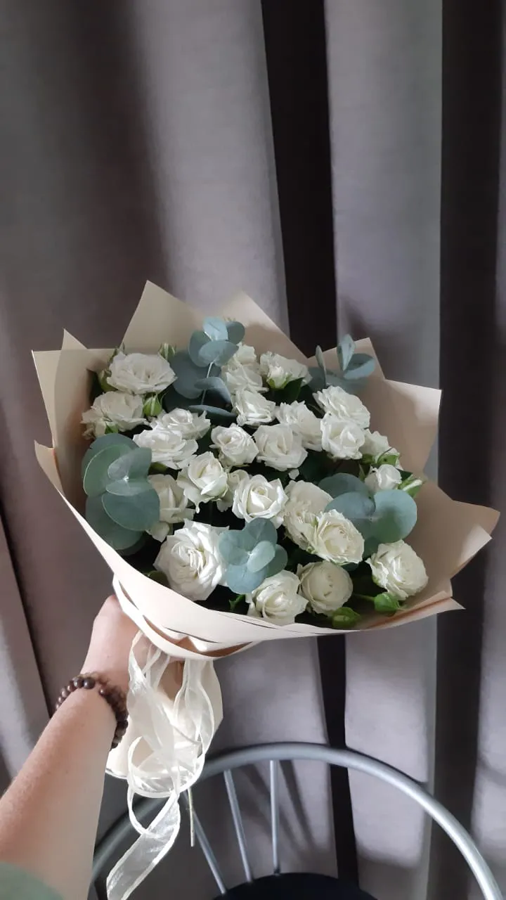 - Премиум -кустовая роза - 9 шт., зелень, упаковка, лента