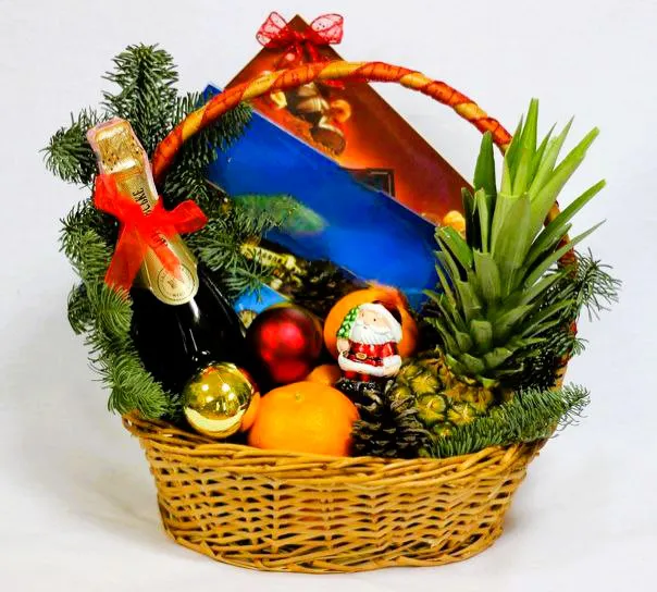 Корзина с апельсинами, ананасом и новогодним декором — это идеальный элемент праздничного настроения.
