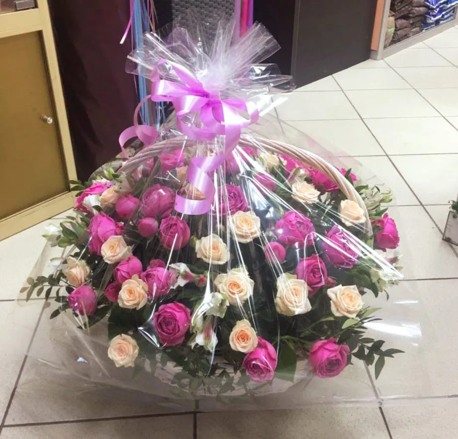 Состав: кустовые розы, альстромерии, зелень, оазис ,корзина