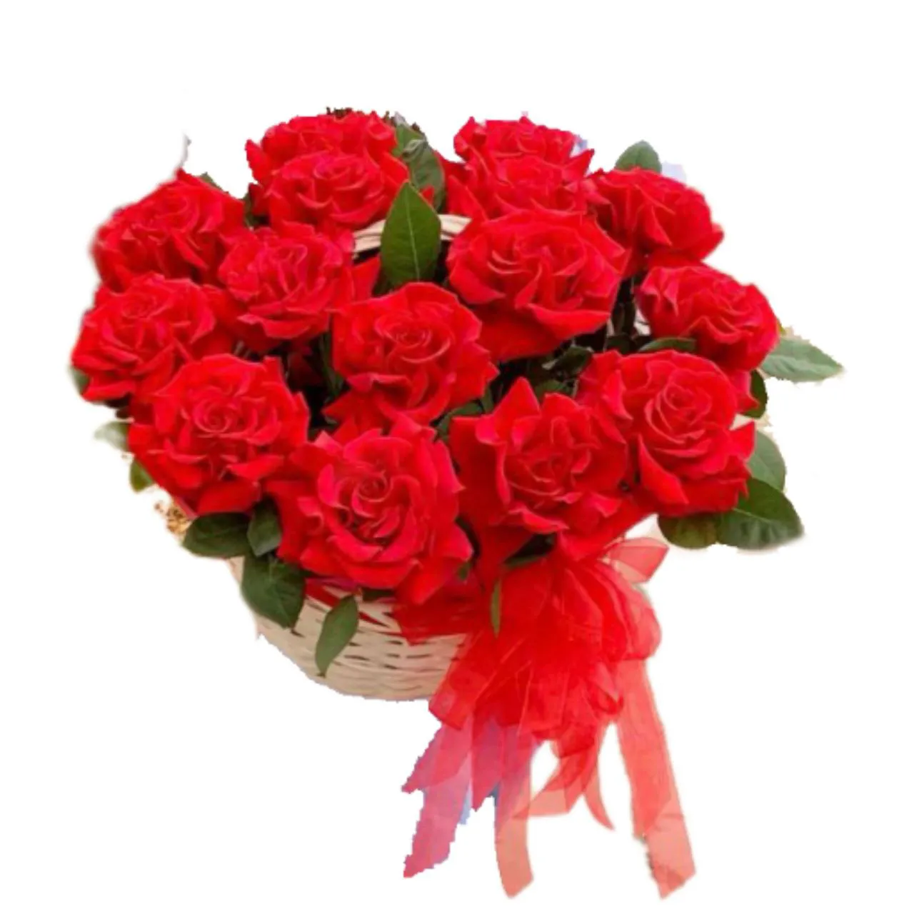 - Стандарт - 15 роз, зелень, корзина, оазис