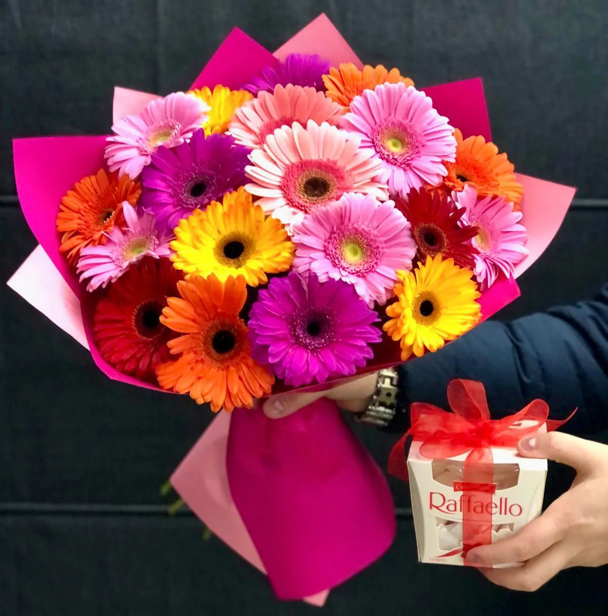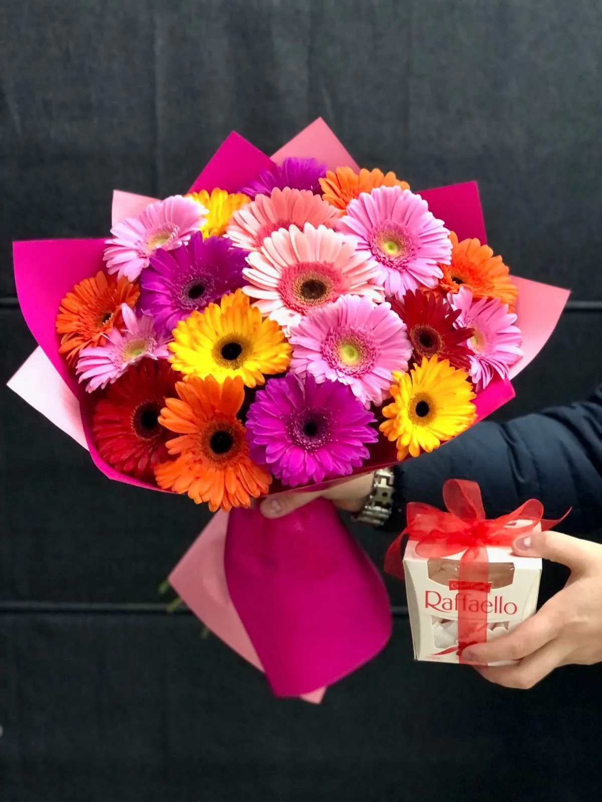 - Стандарт ( гербера - 5 шт., упаковка, лента + рафаэлло)
