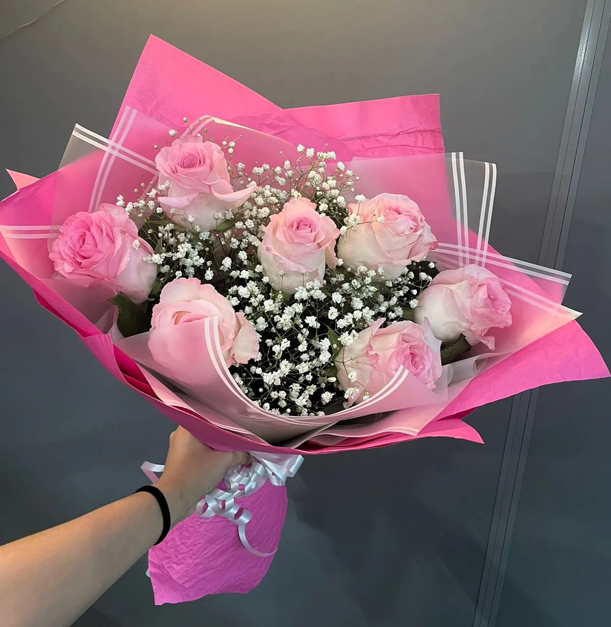 - Стандарт - роза - 7 шт., гипсофила, упаковка, лента