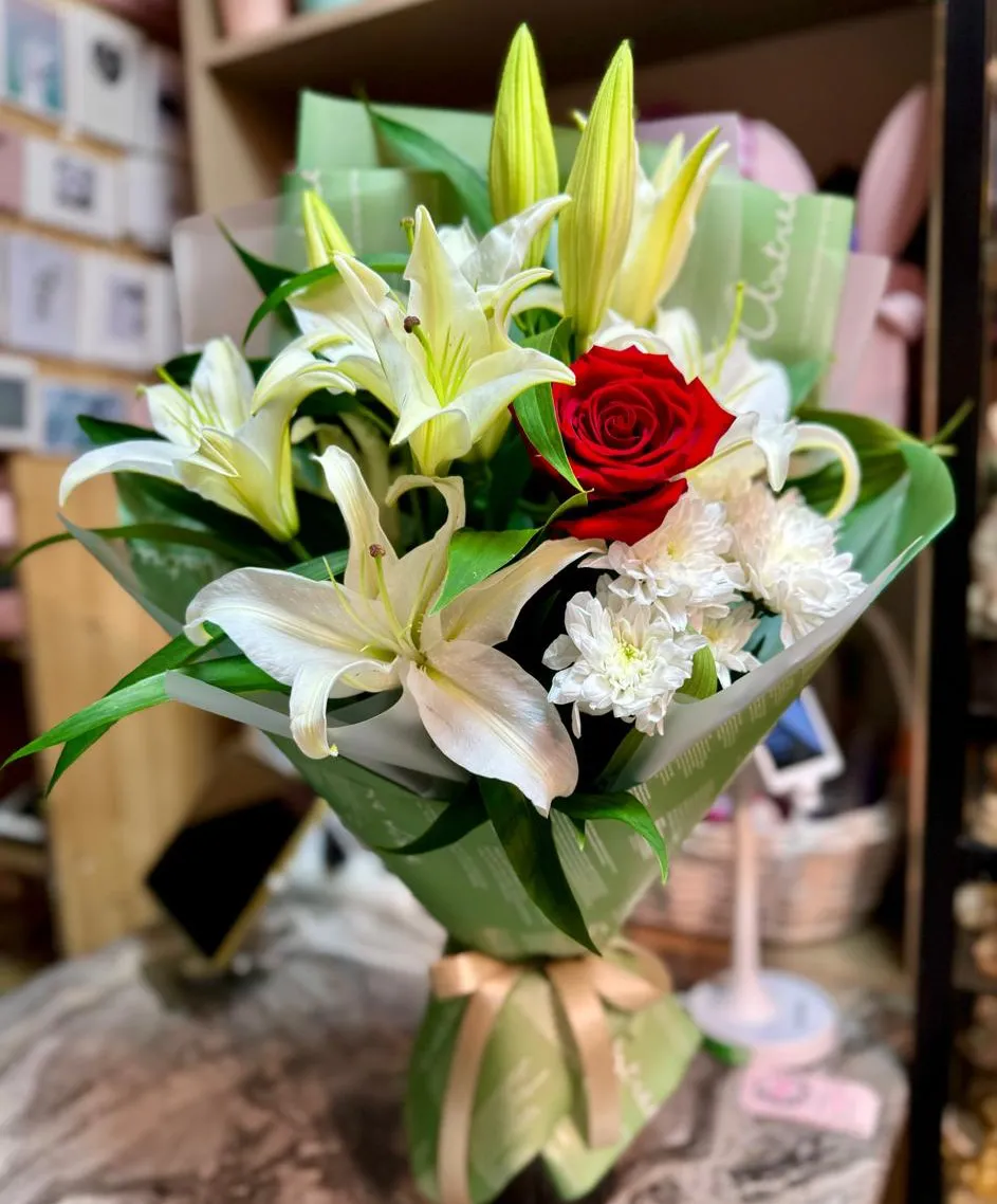 Лилии, роза, кустовая хризантема, упаковка, лента