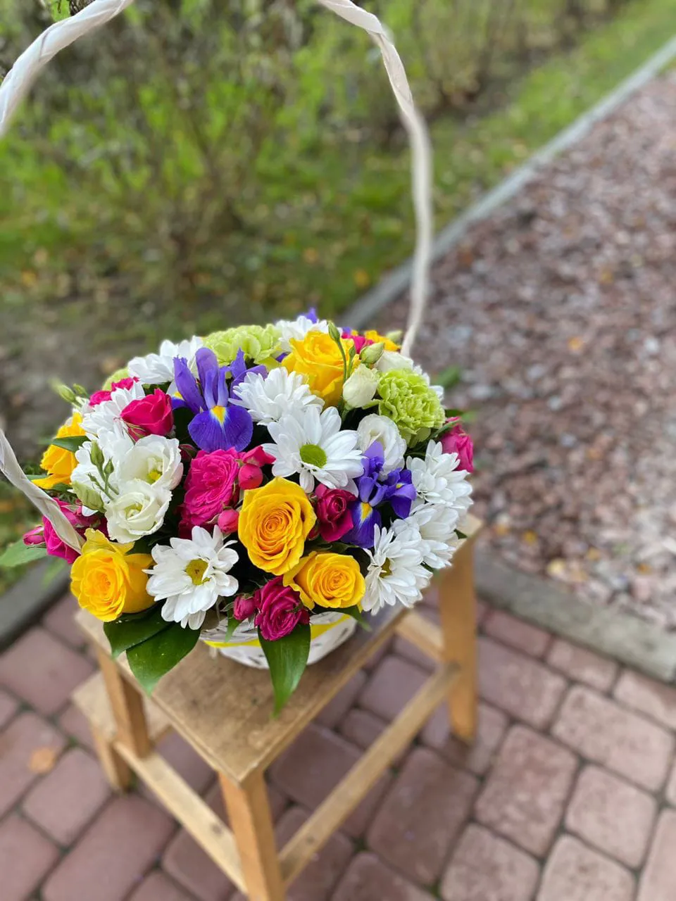 Роза, эустома, хризантема, ирис, гвоздика, салал, оазис, корзина
