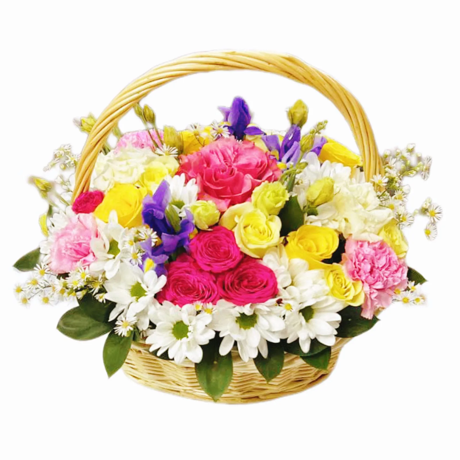Состав букета: роза, эустома, хризантема, ирис, гвоздика, салал, оазис, корзина