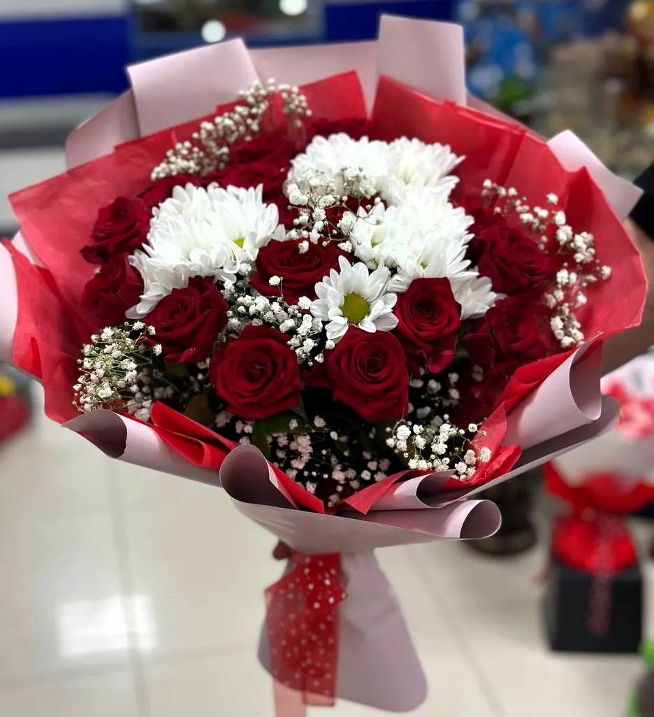 В этом изысканном букете нежно переплетаются яркие красные розы, олицетворяющие страсть и любовь, с белыми хризантемами, символизирующими чистоту и спокойствие. Мягкие, воздушные веточки гипсофилы добавляют композиции легкости и шарма, словно облака, обрамляющие яркие цветы. Каждый элемент букета тщательно подобран, создавая гармонию и элегантность. Красные розы с их бархатистыми лепестками привлекают внимание и восхищение, тогда как белые хризантемы придают изысканность и баланс. Этот букет станет прекрасным подарком, способным передать самые искренние чувства и создать атмосферу уюта и тепла.