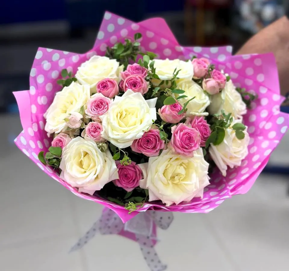 Погрузитесь в очарование этого роскошного букета, где пышные пионовидные розы встречаются с нежными кустовыми розами, создавая*симфонию красоты и утонченности. Каждый бутон – это произведение искусства, излучающее романтику и элегантность. Идеальный подарок для выражения самых искренних чувств. Пионовидные розы*добавляют объем и богатство, а кустовые розы – легкость и нежность. Этот букет станет незабываемым подарком и наполнит день теплом и радостью.