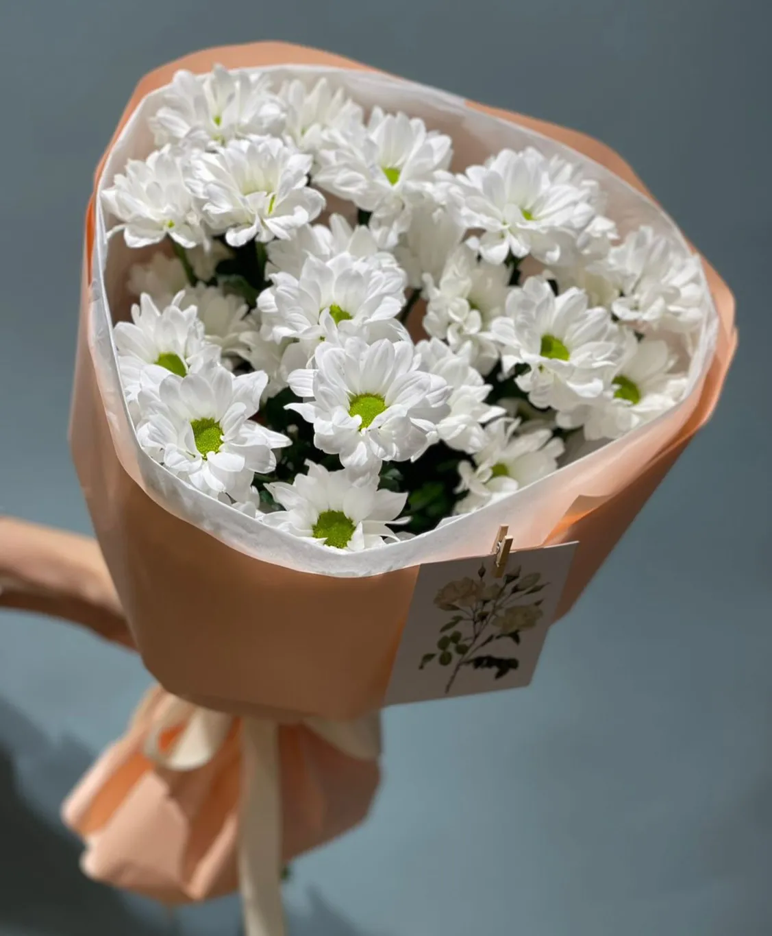 Букет из белых ромашковых хризантем – это воплощение нежности и простоты. Яркие и светлые цветы с белоснежными лепестками, усыпанными мелкими золотистыми сердцевинами, создают атмосферу свежести и радости. Каждый цветок словно собирает в себе солнечный свет, излучая тепло и умиротворение.