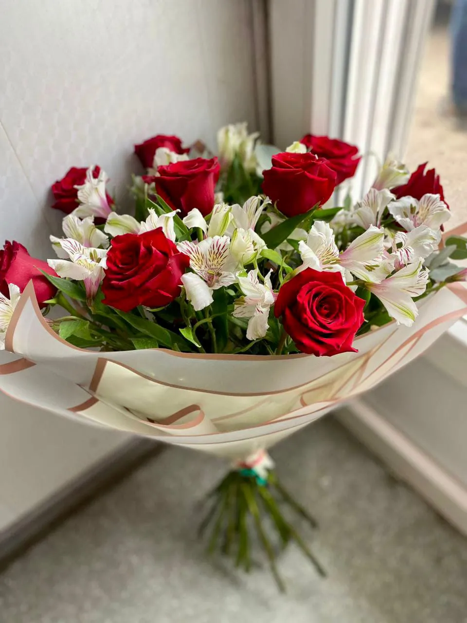 роза альстромерия зелень, упаковка, лента |