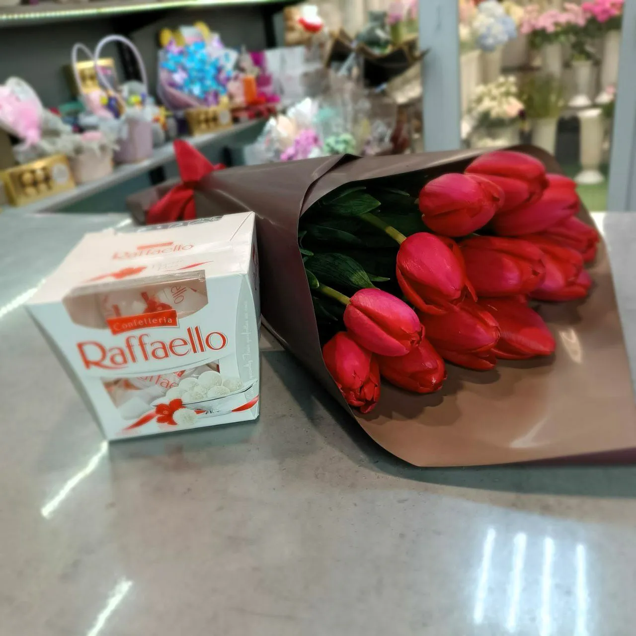 Тюльпаны - 15 шт., упаковка, ленnа + Raffaello |