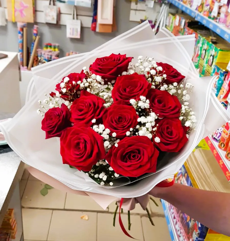- Премиум - роза - 11 шт., гипсофила, упаковка, лента