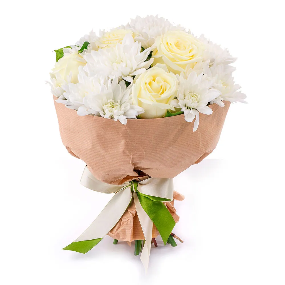 Вариант—Стандарт - роза - 5 шт., хризантема - 2 шт., упаковка, лента