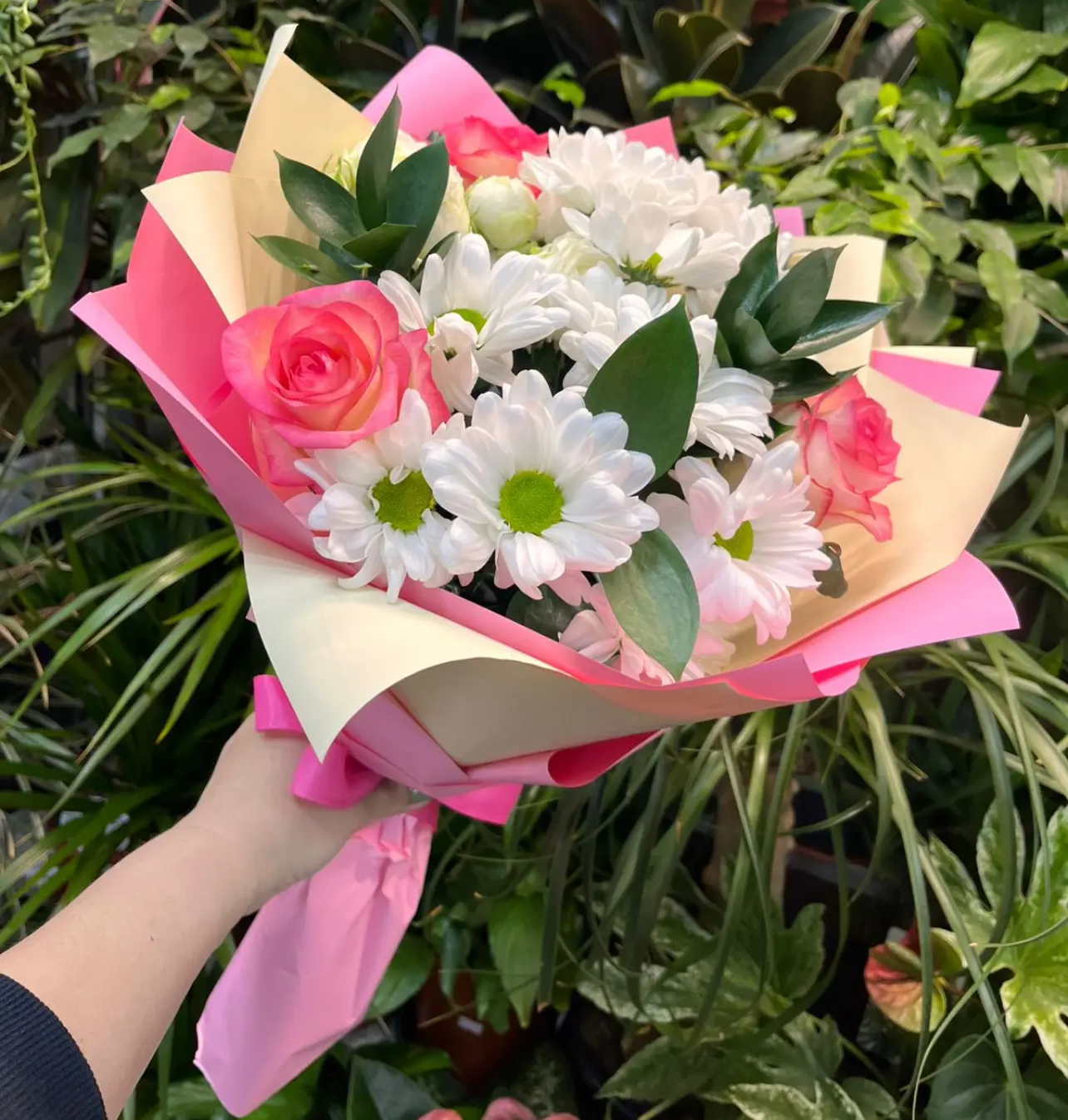Яркая разноцветная упаковка добавляет букету динамику и современный стиль, подчёркивая красоту каждого цветка и делая композицию по-настоящему запоминающейся. Такой букет идеально подойдёт для подарка, который вызывает улыбки и дарит тёплые эмоции.