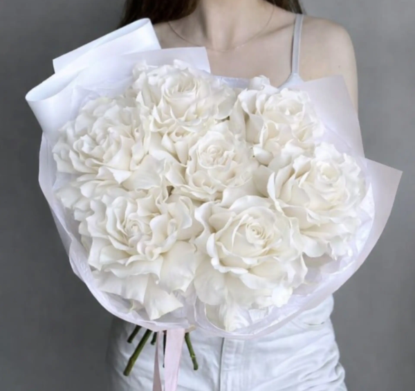 Белая упаковка гармонично дополняет цветы, подчёркивая их естественную красоту и создавая цельный, элегантный образ. Такой букет станет идеальным подарком для выражения искренних чувств, уважения и нежной заботы.