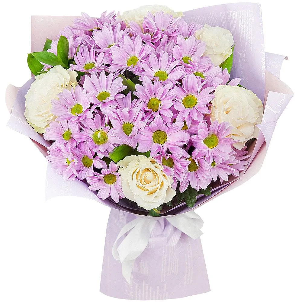 - Стандарт (Кустовая хризантема 4 шт,, роза 5шт, зелень, упаковка, лента)