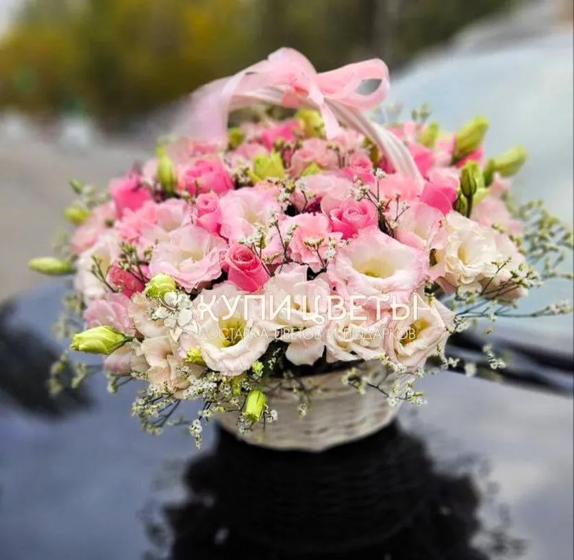 Розы, эустома, гвоздика, зелень, оазис, корзина |
