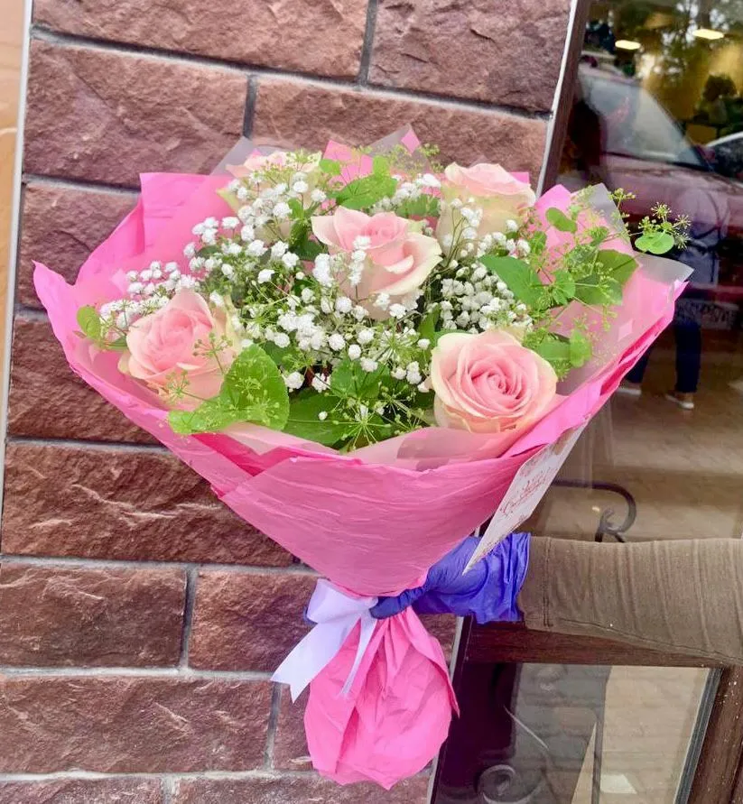 Вариант—Мини - роза - 5 шт., гипсофила, упаковка, лента
