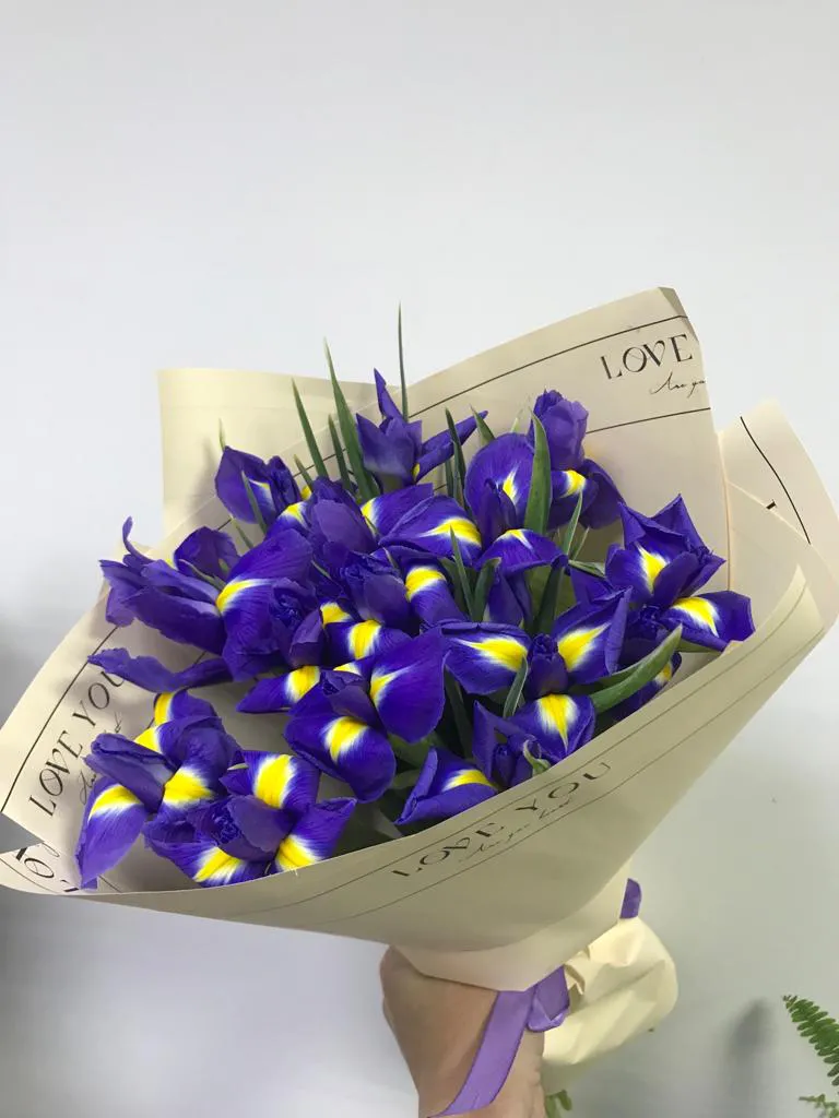 Синие ирисы – универсальные цветы, дарятся и женщине. Ирисы символизируют искренность и доверие. Подарить можно другу, коллеге или члену семьи, повод не важен – эмоции точно будут положительными.