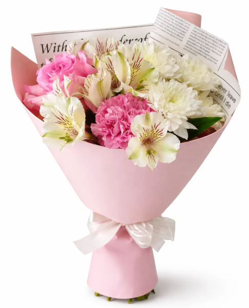 Нежный и многогранный букет, в котором изящная розовая роза задаёт утончённый тон композиции. Её гармонично дополняют мягкая розовая гвоздика, воздушная кустовая хризантема и лёгкая альстромерия, создавая объёмный и живой ансамбль с романтичным настроением.