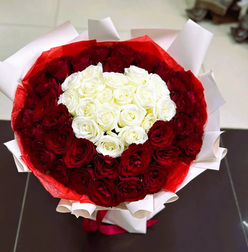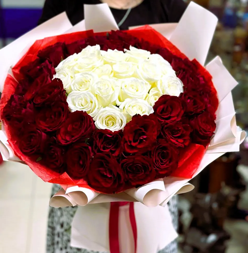 Подарите своим близким настоящий шедевр — букет из 51 красно-белой розы в форме сердца! Этот изысканный подарок станет символом вашей любви и привязанности. Красные розы олицетворяют страсть и романтику, а белые — чистоту и нежность. Совместив эти два цвета, вы создаете гармонию и уникальность, которые поразят любого получателя.