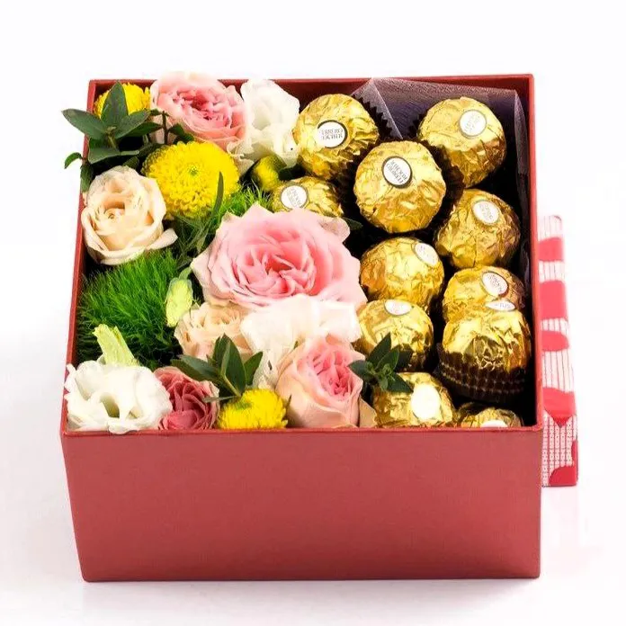 Шляпная коробка с Ferrero Rocher и цветам — идеальное сочетание элегантности и ароматного удовольствия! Создайте незабываемые моменты, наполнив их сладкими радостями и яркими эмоциями.