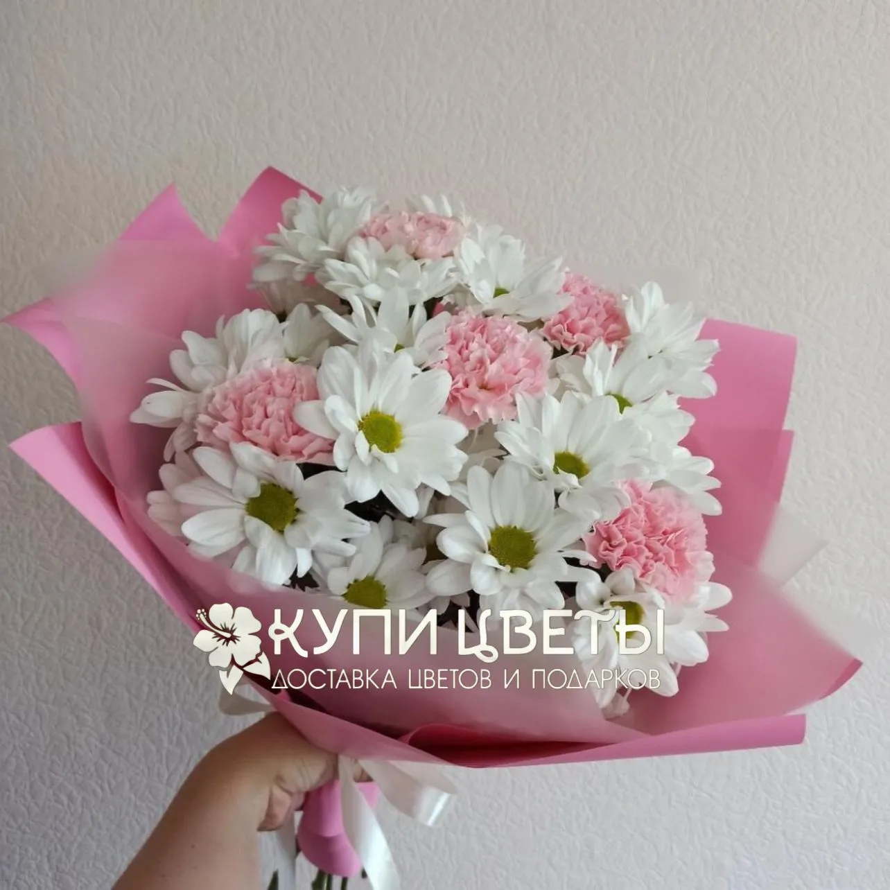 Гвоздики, кустовые хризантемы, упаковка, лента |