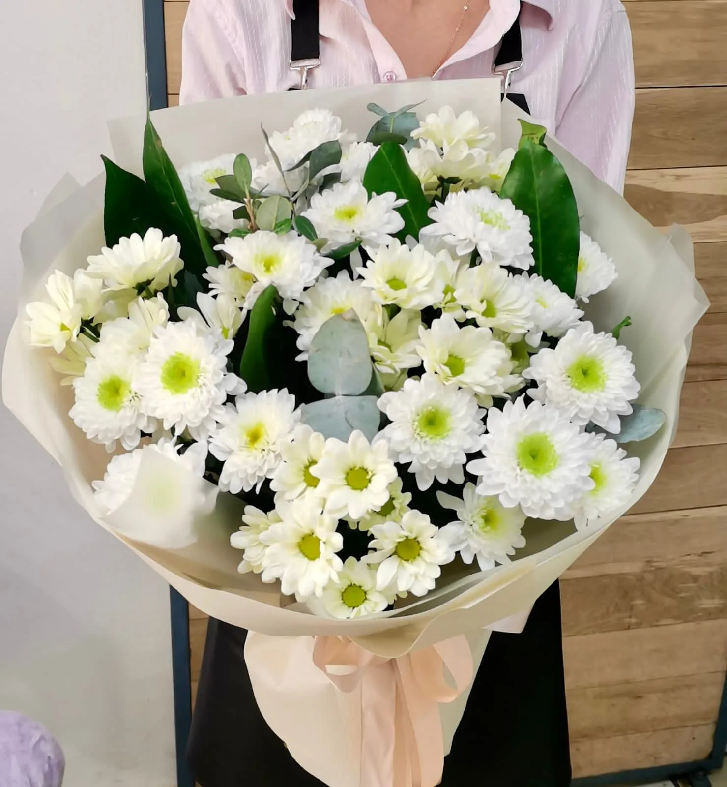 Белые ромашковые хризантемы подарят улыбку и весеннее настроение в любое время года.