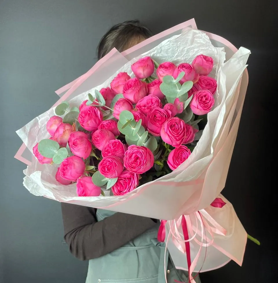 - Средний - кустовая роза - 7 шт., зелень, упаковка, лента