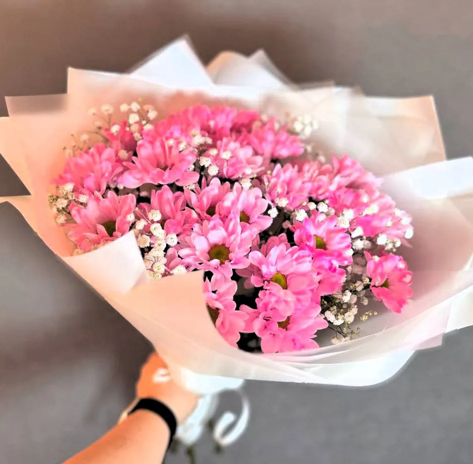 Этот нежный и утонченный букет станет идеальным подарком для любого торжества или просто для поднятия настроения. Розовые кустовые хризантемы, символизирующие заботу и восхищение, в сочетании с воздушной гипсофилой создают гармоничную композицию, которая привлекает взгляд и радует сердце.