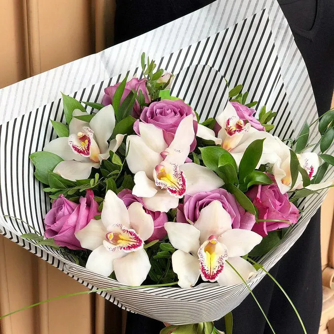 - Средний - орхидея - 5 шт., роза - 7 шт., зелень, упаковка, лента