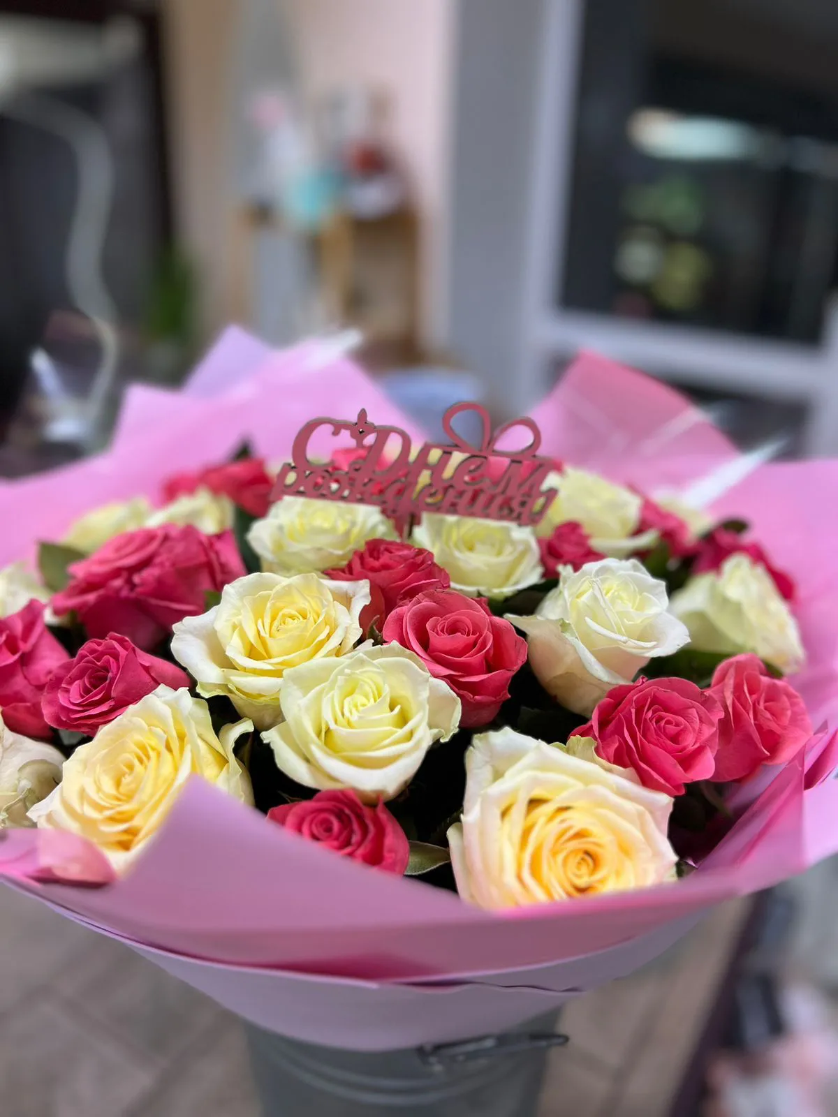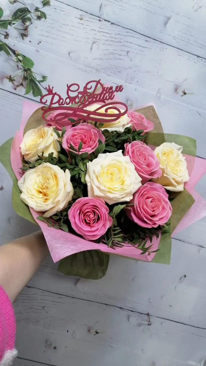 Букет из розовых и белых роз в подарок на день рождения