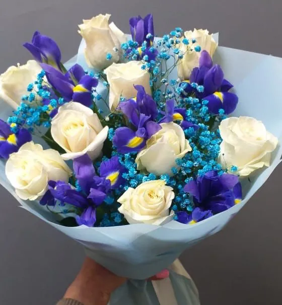 Позвольте представить вам волшебное сочетание, где нежность и элегантность сплетаются в едином дыхании - букет из ирисов и белых роз.