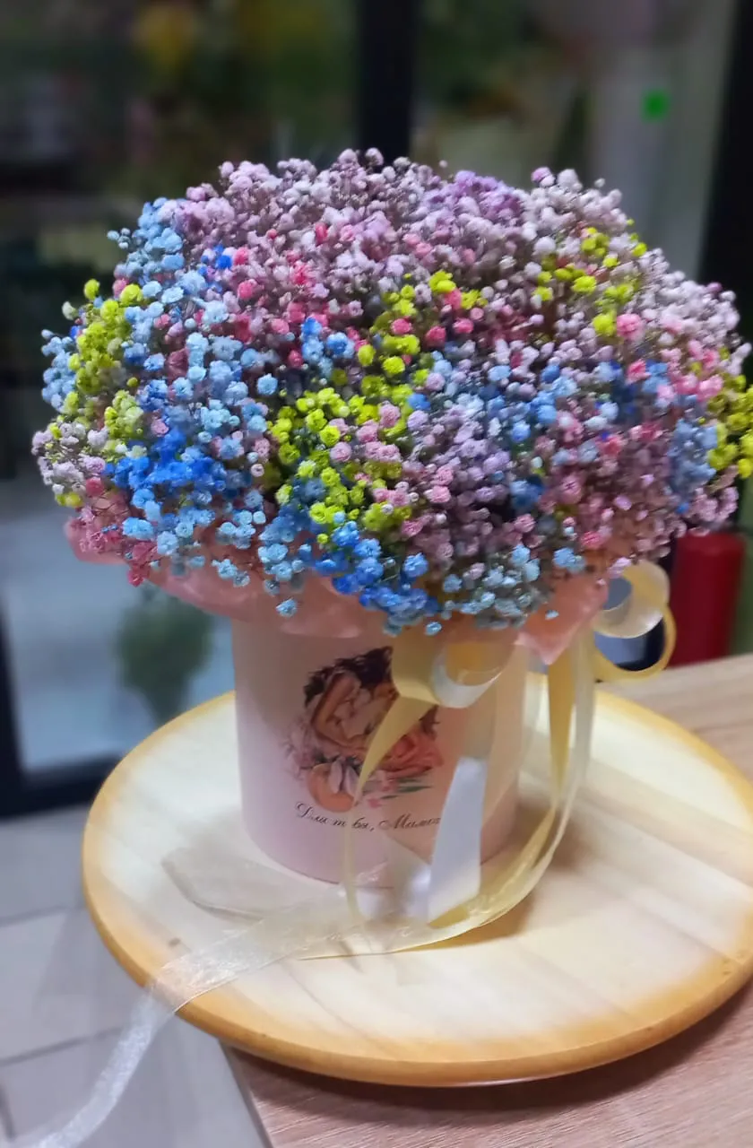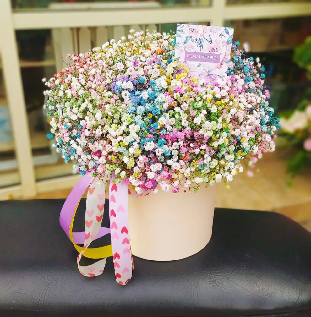 Нежная и воздушная композиция из гипсофилы в радужных оттенках, обязательно понравится получателю! Композиция будет радовать своей красотой очень долго ! Цветы расскажут о нежном и искреннем отношении, помогут признаться в романтических чувствах.. Это отличное украшение для любого праздника, подарок уместный для любого мероприятия. Пышность и объем готового букета будет зависеть от выбранного Вами количества цветов.