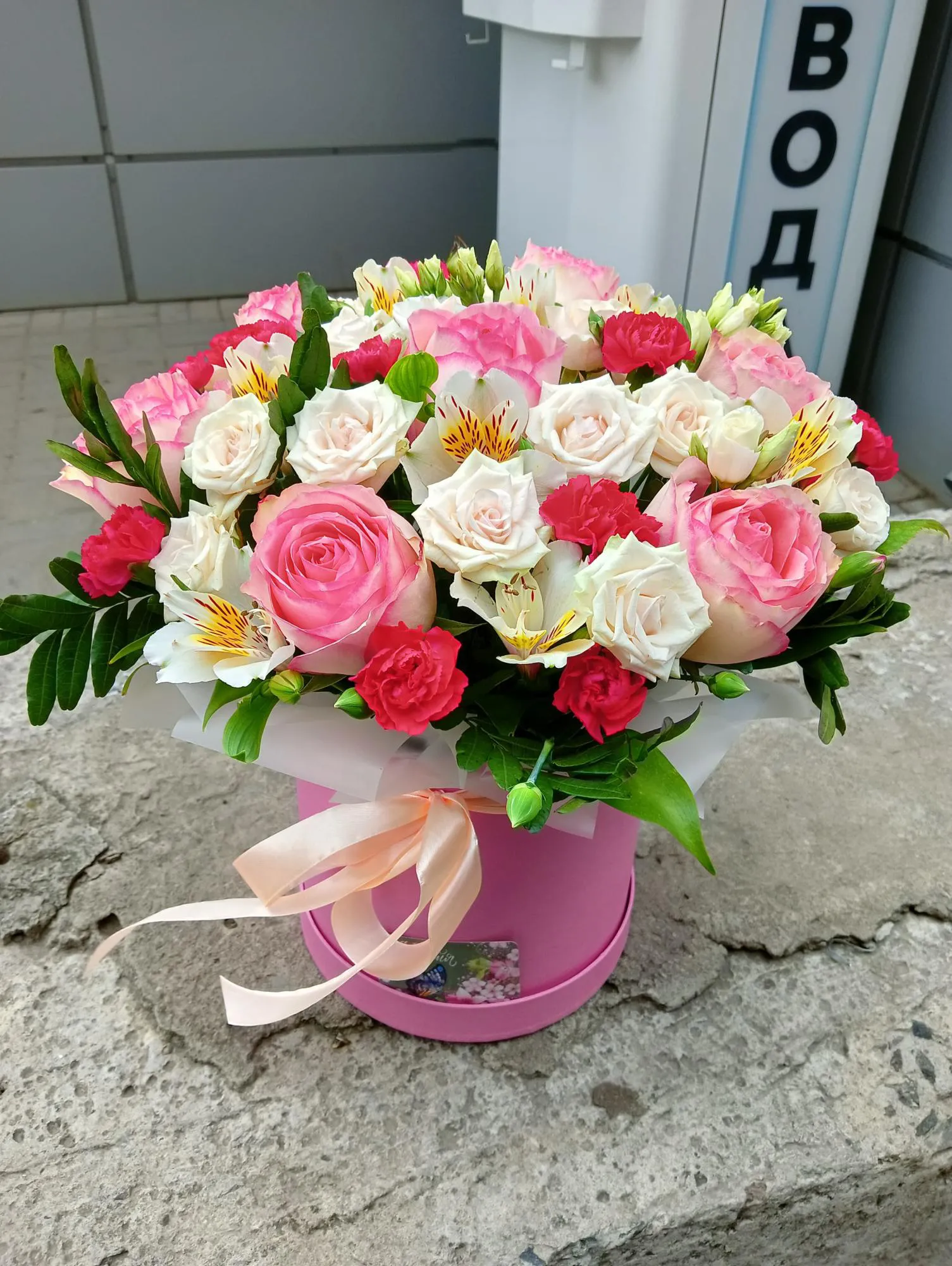 Состав: роза - 7 шт., эустома - 3 шт., гвоздика- 7 шт., зелень, коробка, оазис.