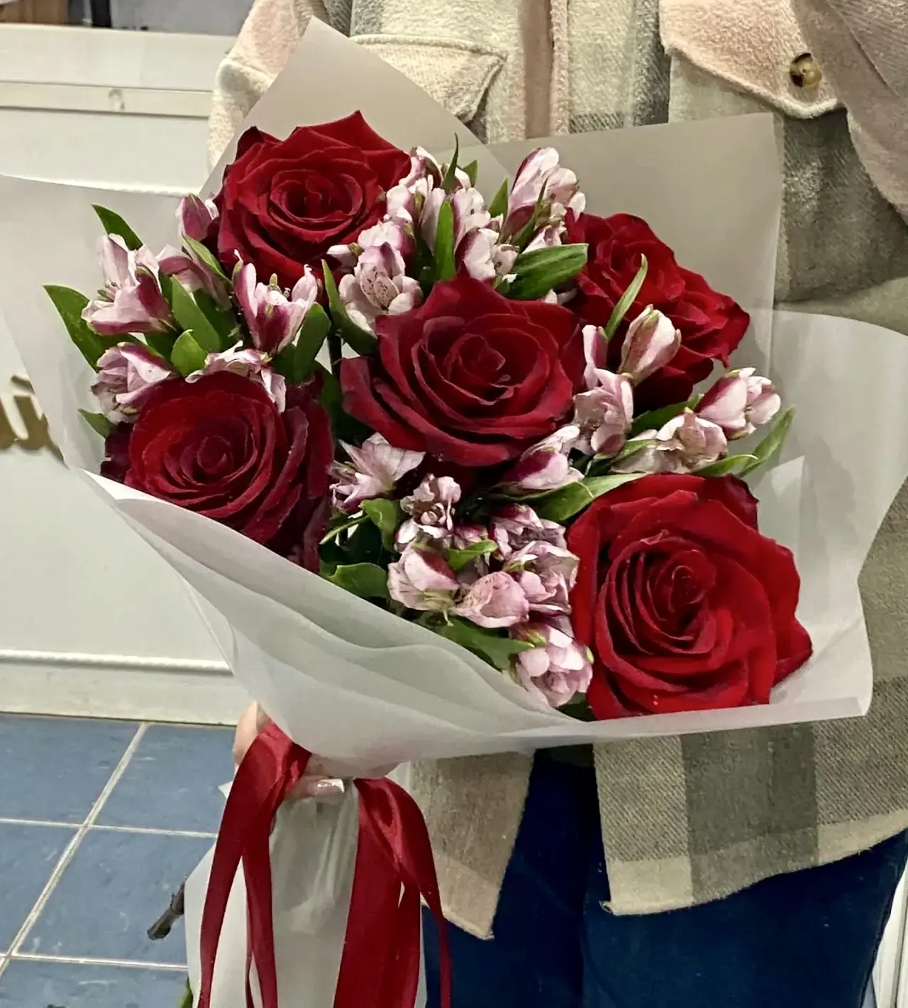 роза-5шт, альстромерия - 7шт, упаковка, лента |