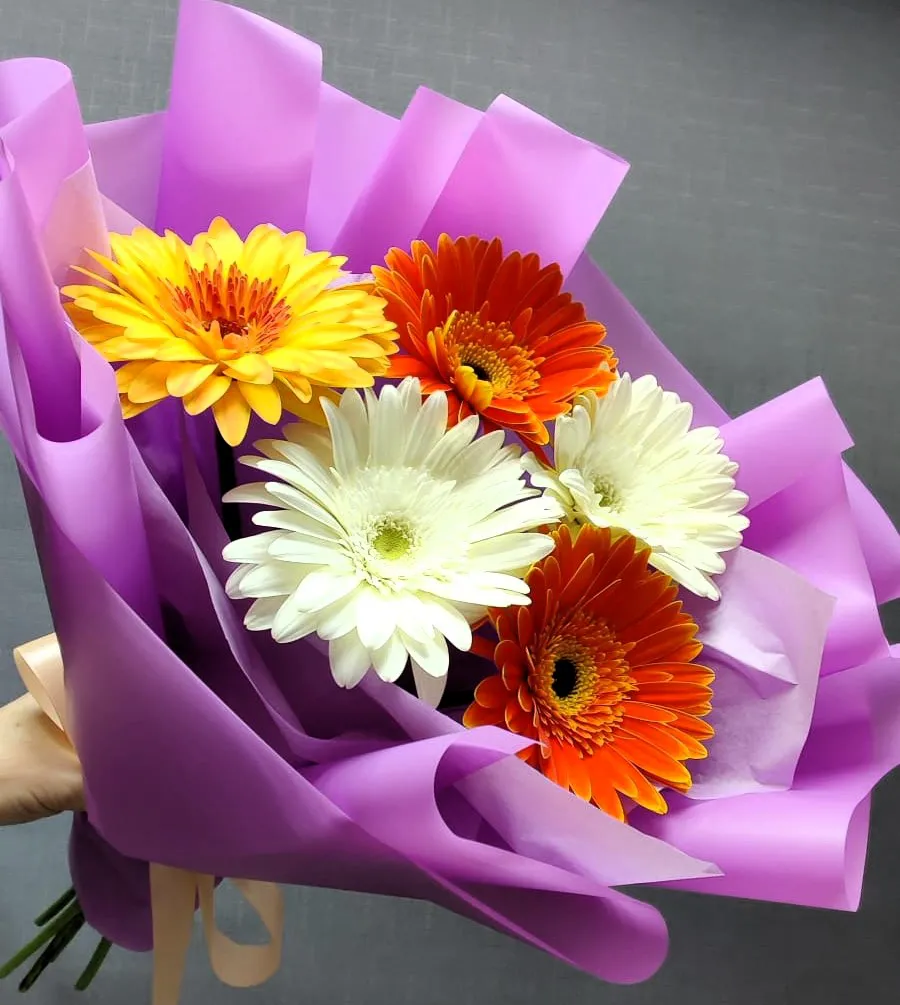 Букет из 5 гербер микс в красивой упаковке