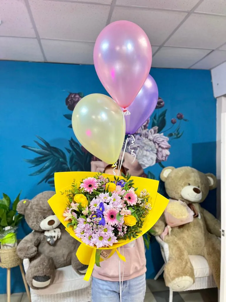 - Стандарт (роза - 3 шт., гербера - 2 шт., альстромерия - 2 шт., кустовая хризантема - 2 шт., ирис - 2 шт., зелень, упаковка, лента)