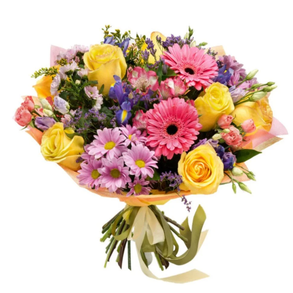 розы, герберы, альстромери, кустовые хризантемы, ирисы., зелень, упаковка, лента