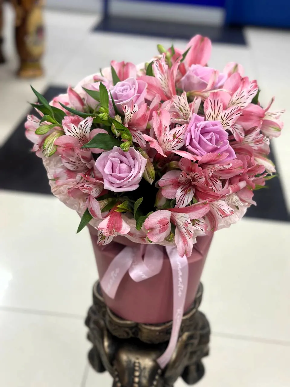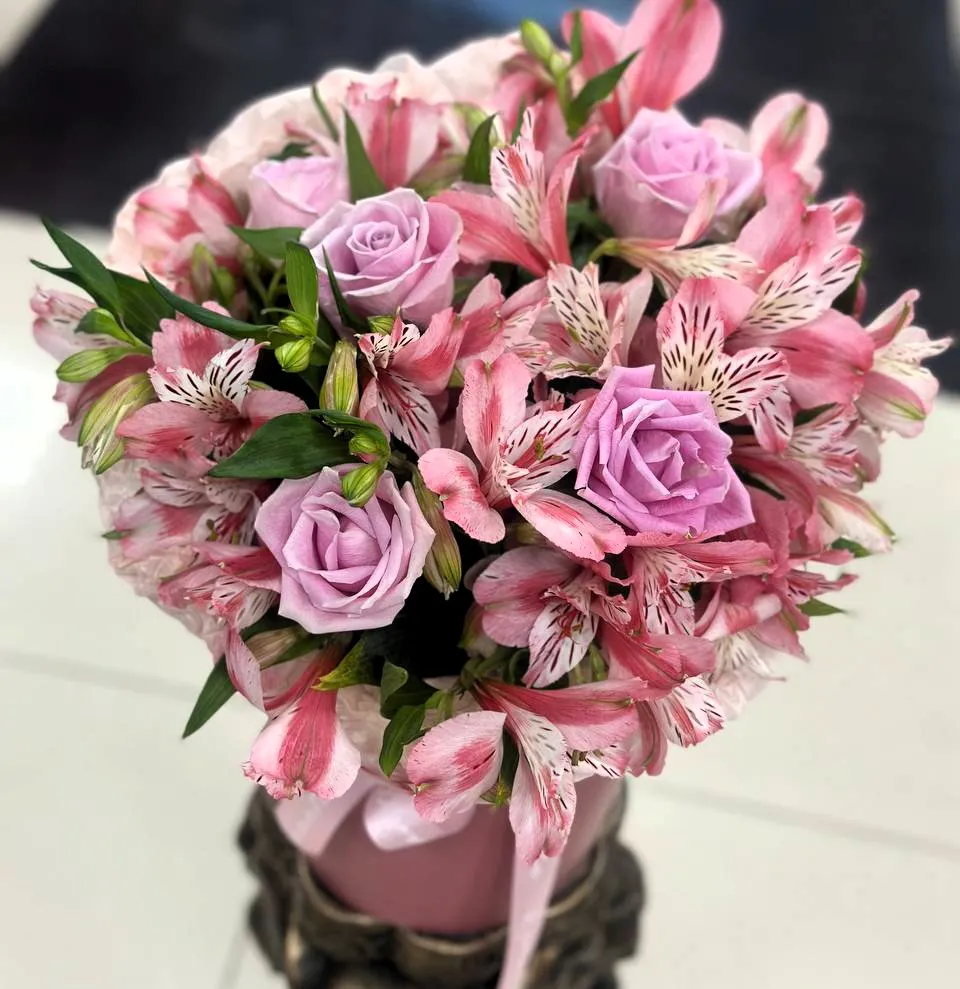Окунитесь в нежную сказку с этой очаровательной шляпной коробкой, наполненной изысканными розами** и воздушными альстромериями в восхитительных розовых тонах. Идеальный подарок, чтобы выразить свои самые искренние чувства. Эта композиция – это воплощение нежности, красоты и элегантности, созданное для самых особенных моментов. Подарите **розовые розы** и **альстромерии** в стильной шляпной коробке, чтобы напомнить о своей любви и восхищении.