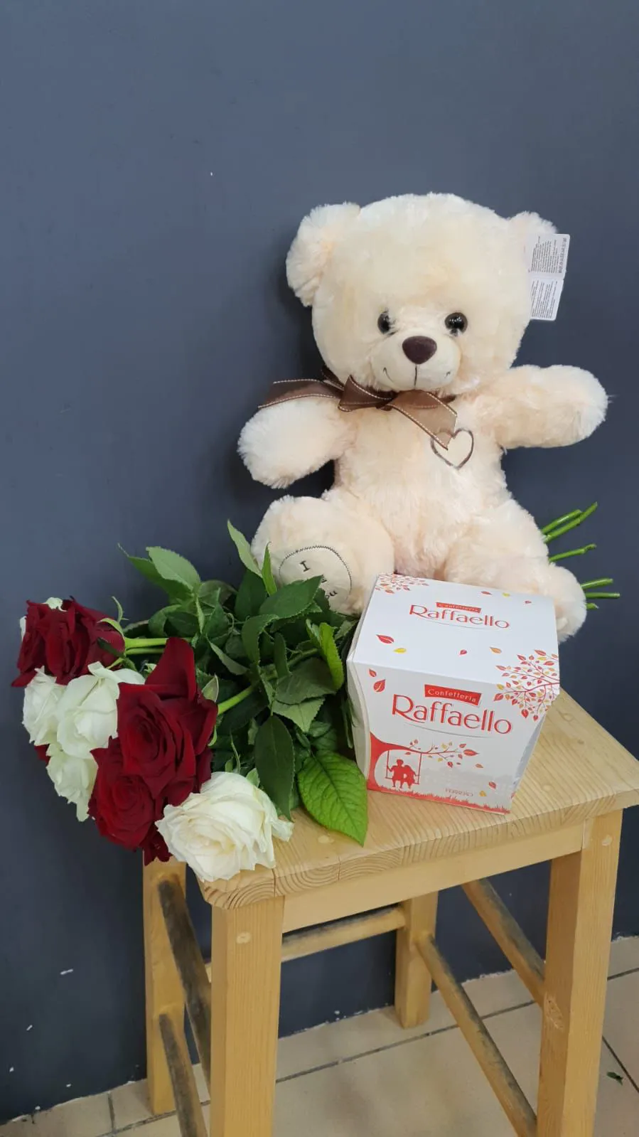 11 роз, мягкая игрушка 25 см и коробка Raffaello 150 гр.