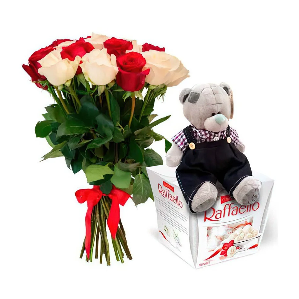 11 роз, мягкая игрушка 25 см и коробка Raffaello 150 гр. |