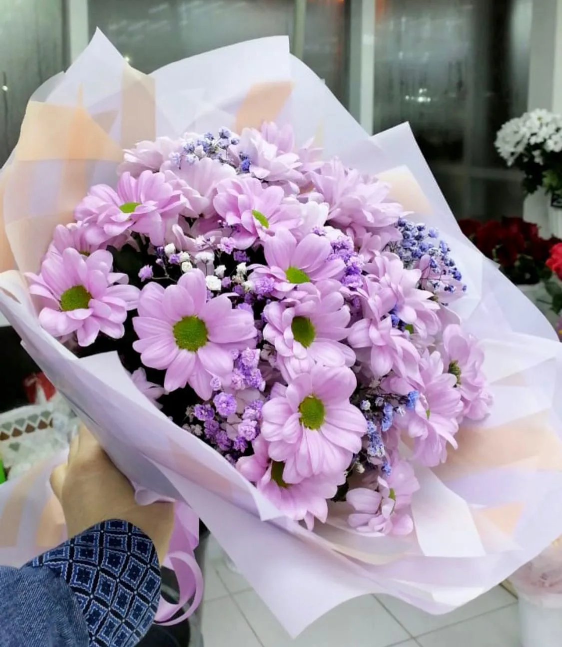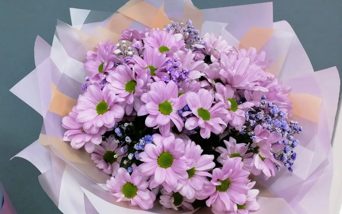 кустовая хризантема , гипсофила , упаковка, лента |