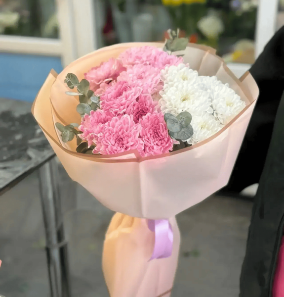 Нежный и утончённый букет из белых и розовых кустовых хризантем с веточками эвкалипта - это гармония свежести, лёгкости и природной красоты. Пастельные оттенки создают атмосферу уюта и тепла, а серебристо-зелёный эвкалипт добавляет композиции изысканный аромат и воздушность.